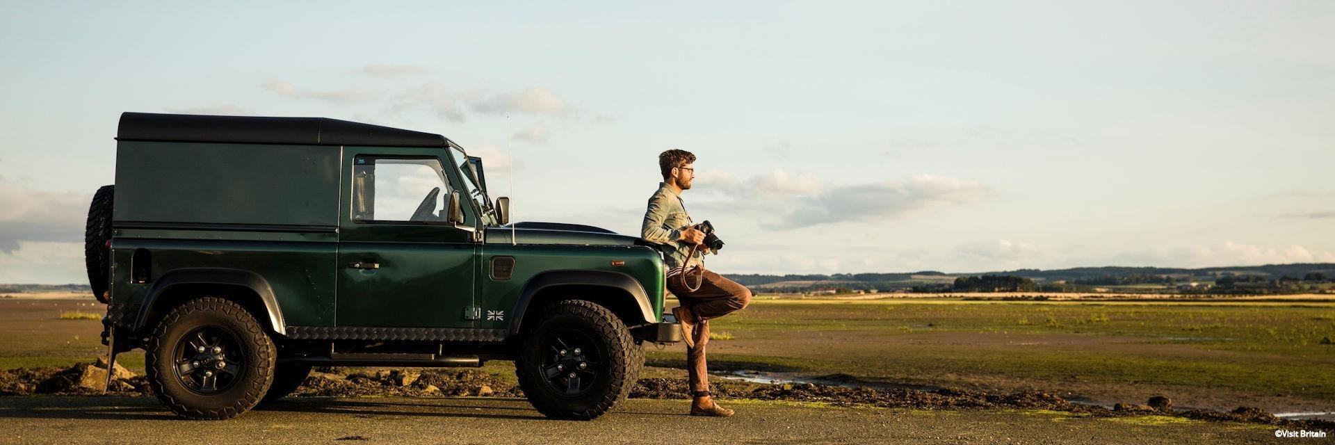 • huur van een klassieke Land Rover Defender